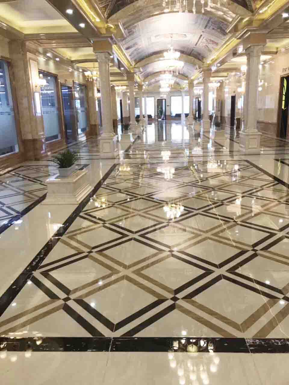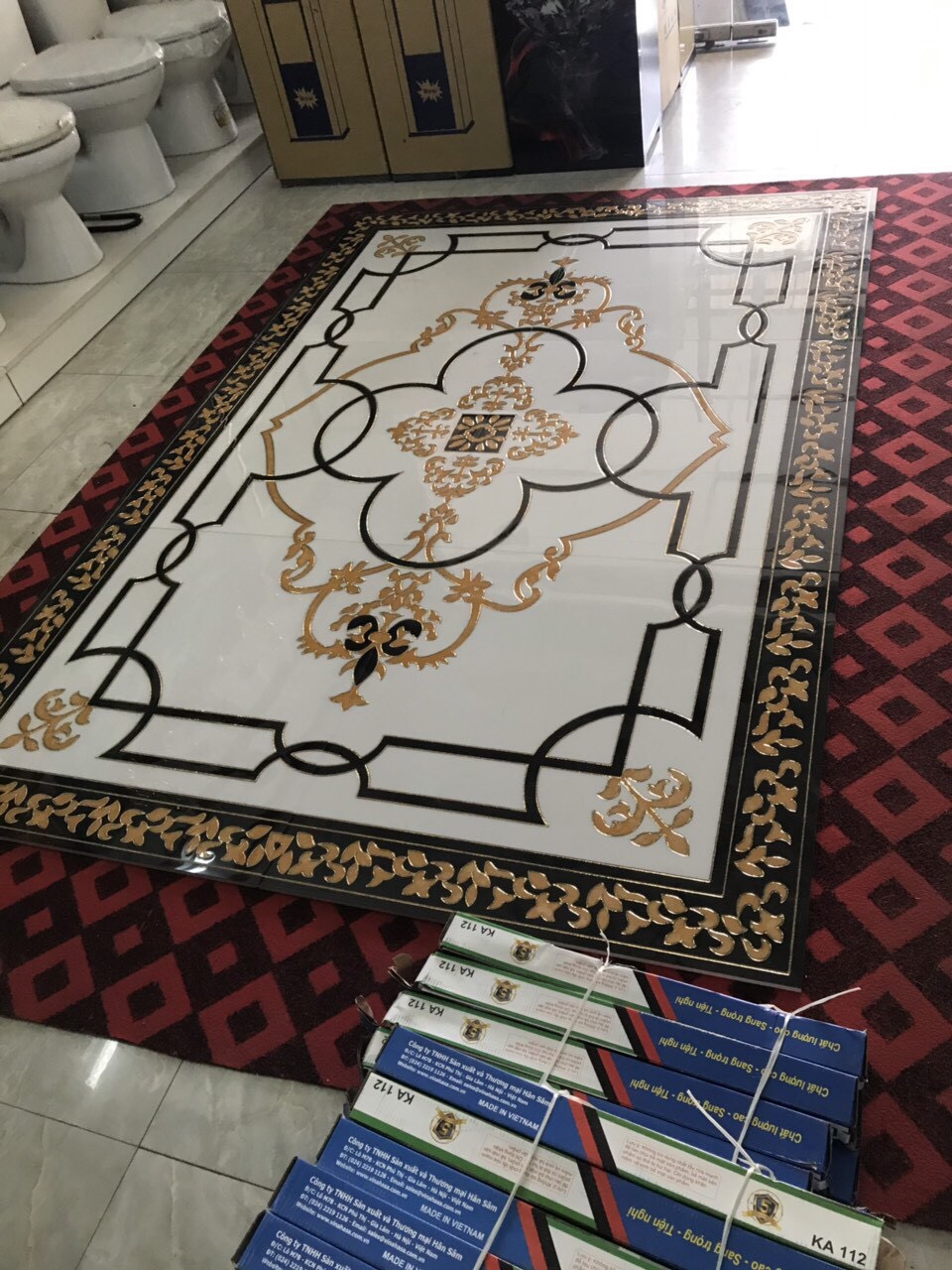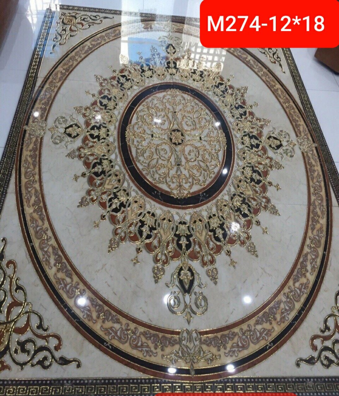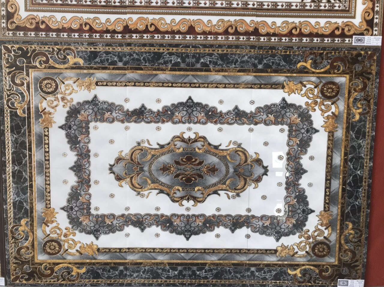 Đặc biệt đây là loại gạch có kích thước không giới hạn gồm 3 viên góc- cạnh – nhân liên kết thành bộ thảm theo ý muốn. Màu sắc chủ đạo của mẫu gạch thảm lát phòng khách này là màu vàng và trắng. Màu vàng đại diện cho quyền quý, màu trắng đại diện cho vẻ đẹp sang trọng và lịch lãm.