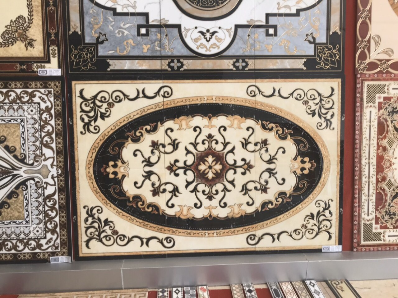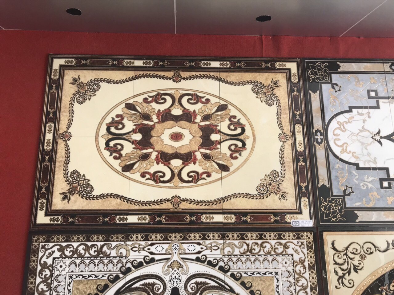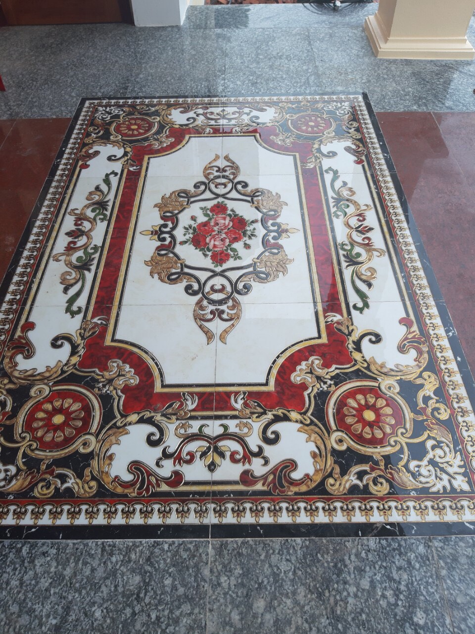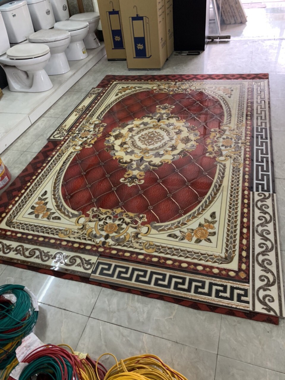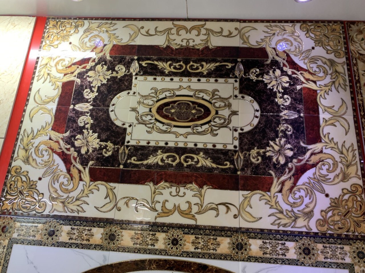 Đặc biệt đây là loại gạch có kích thước không giới hạn gồm 3 viên góc- cạnh – nhân liên kết thành bộ thảm theo ý muốn. Màu sắc chủ đạo của mẫu gạch thảm lát phòng khách này là màu vàng và trắng. Màu vàng đại diện cho quyền quý, màu trắng đại diện cho vẻ đẹp sang trọng và lịch lãm.